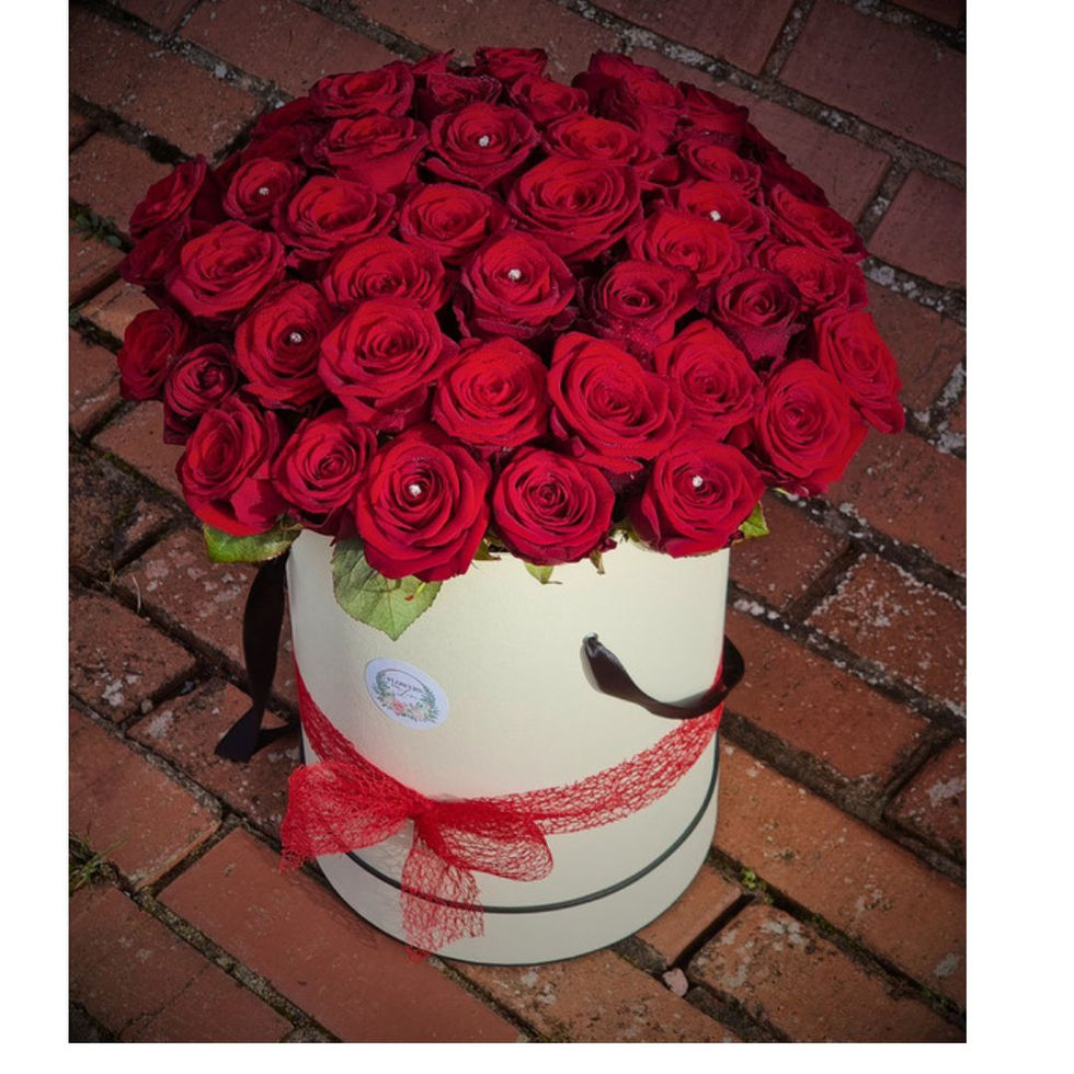 50 Red Naomy Roses. Roses are best kept in a tall vase with water away from direct sunlight or heating.